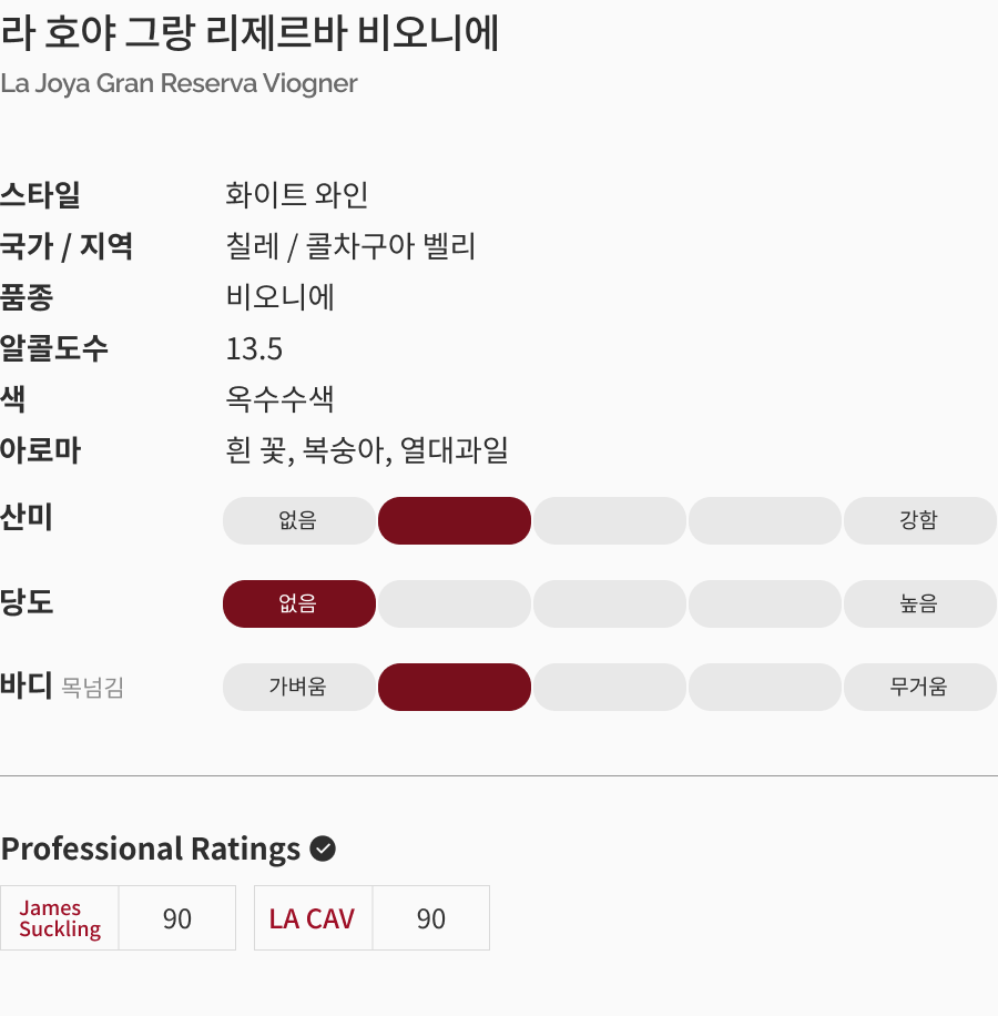 Mouth : 미디엄 바디 와인으로 미네랄 노트가 와인에 복합미를 더하고 풍성한 과일향에 잘 어울리는 산도는 지속적인 고급스러움을 만든다.