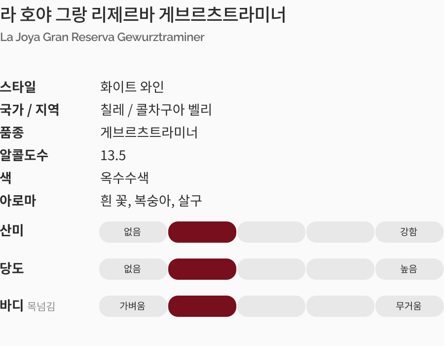 Nose : 복숭아, 살구, 모과와 같은 과실향과 자스민과 흰 꽃향
