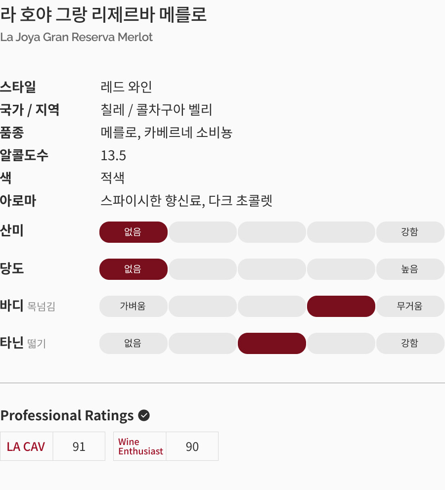 Nose : 딸기 등의 붉은 과실류의 섬세한 향, 야생 버섯 등의 오키한 노트