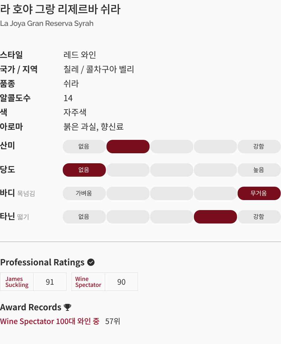 Mouth : 미디엄 바디 와인으로 섬세한 타닌과 탄탄한 구조감이 특징이며 배럴 숙성에서 얻어진 가죽, 토스티한 향이 더해져 복합적인 풍미를 자랑한다.
