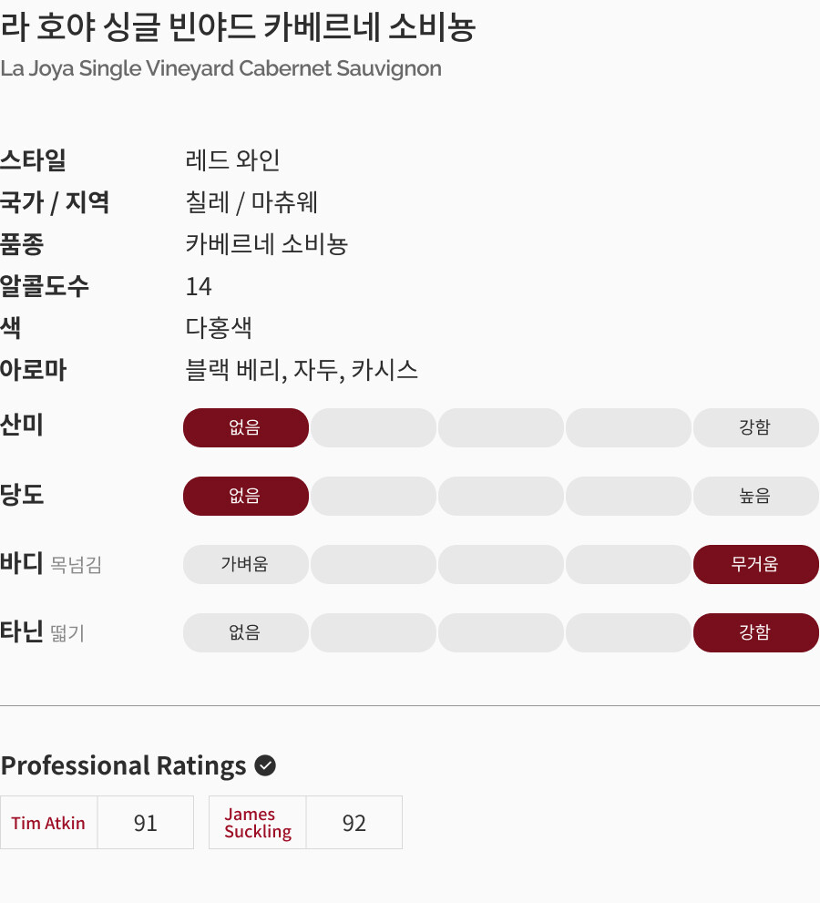Mouth : 풀 바디 와인으로 묵직한 과일의 풍미, 향긋한 향신료, 실키한 타닌이 특징이다.
