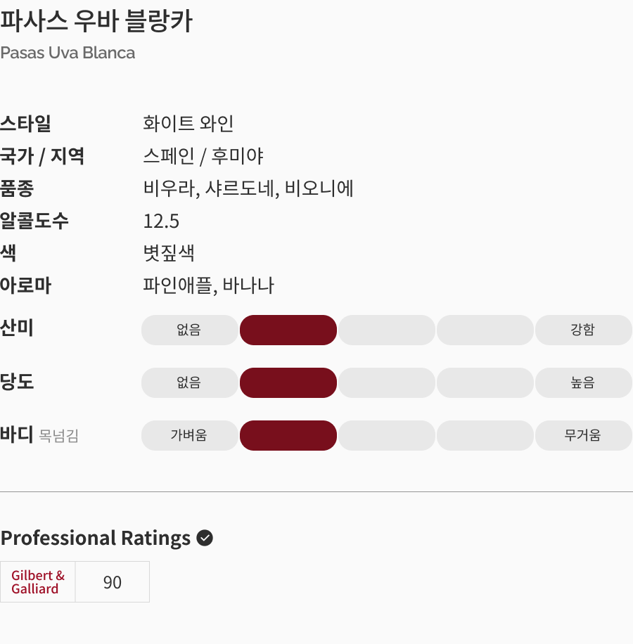 포도의 자연 당이 그대로 남아 있으며, “PASA”는 스페인어로 ‘건포도’라는 뜻으로 와인의 특징을 표현한다.