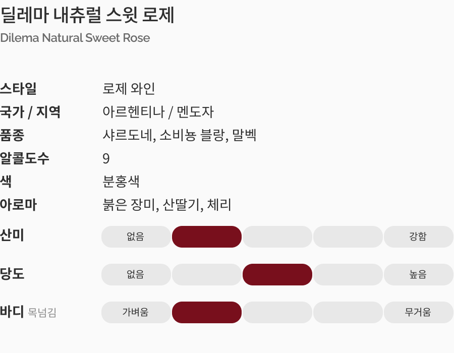 • ‘Dilema (딜레마)’는 하루를 피곤하게 만든 ‘Dilemma(딜레마)’를 신선하고 친근한 딜레마와 인과 함께 즐겁게 잊을 수 있는 와인이라는 컨셉으로 만들어졌다. 신선한 과일향과 기분 좋은 달콤 함으로 와인을 마시는 동안 매 순간을 즐길 수 있는 와인!