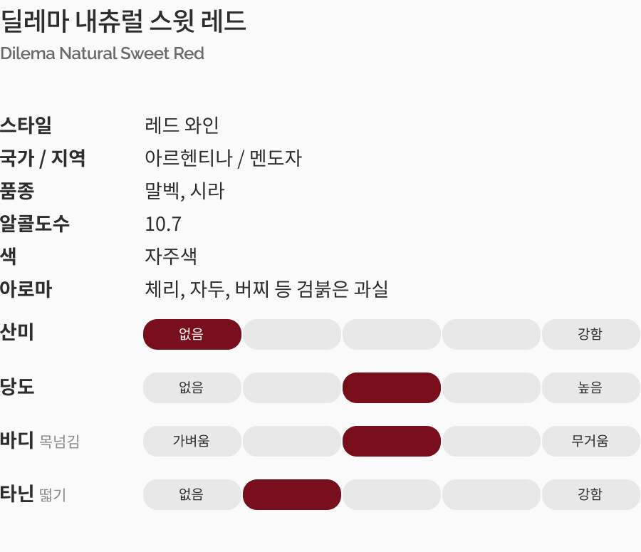 • ‘Dilema (딜레마)’는 하루를 피곤하게 만든 ‘Dilemma(딜레마)’를 신선하고 친근한 딜레마와 인과 함께 즐겁게 잊을 수 있는 와인이라는 컨셉으로 만들어졌다. 신선한 과일향과 기분 좋은 달콤 함으로 와인을 마시는 동안 매 순간을 즐길 수 있는 와인!