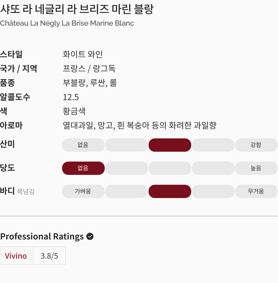 • 랑그독 지역의 최고급 와인이자 로버트 파커로부터 100점을 받은 와인을 생산하는 도메인으로 매년 최고의 점수를 받으며 명성을 쌓은 La Négly의 대중적인 와인 “La Brise Marine” 은 “바다에서 부는 미풍”이라는 뜻으로 바다를 마주하고 있는 포도밭의 영향으로 미네랄, 풍성하고 신선한 과일향이 특징이다.