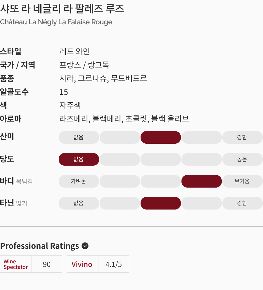 • 랑그독 지역의 최고급 와인이자 로버트 파커로부터 100점을 받은 와인을 생산하는 도메인으로 매년 최고의 점수를 받으며 명성을 쌓은 La Négly의 대중적인 와인