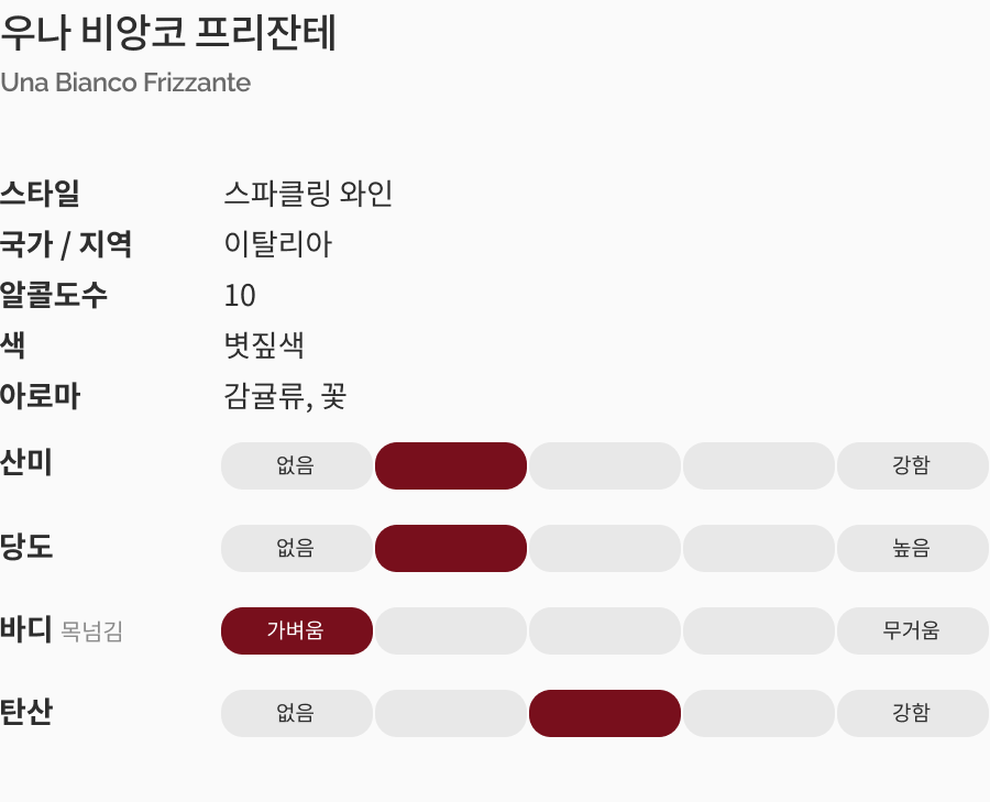 밝고 투명한 볏짚색, 사과, 라임, 감귤류의 지속적인 과일향, 적절한 산도와 청량감을 더하는 산뜻한 버블