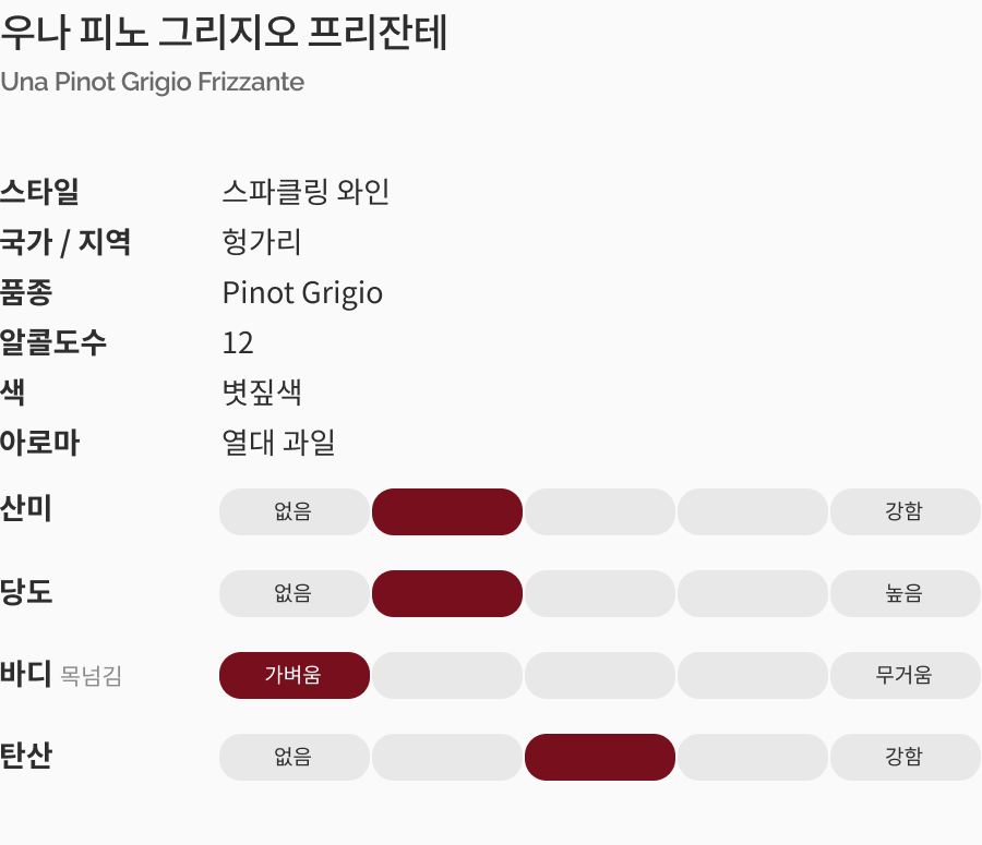 밝고 투명한 황금빛, 신선한 흰 복숭아, 상큼한 시트러스, 우아한 구조감과 청량감을 더하는 산뜻한 버블