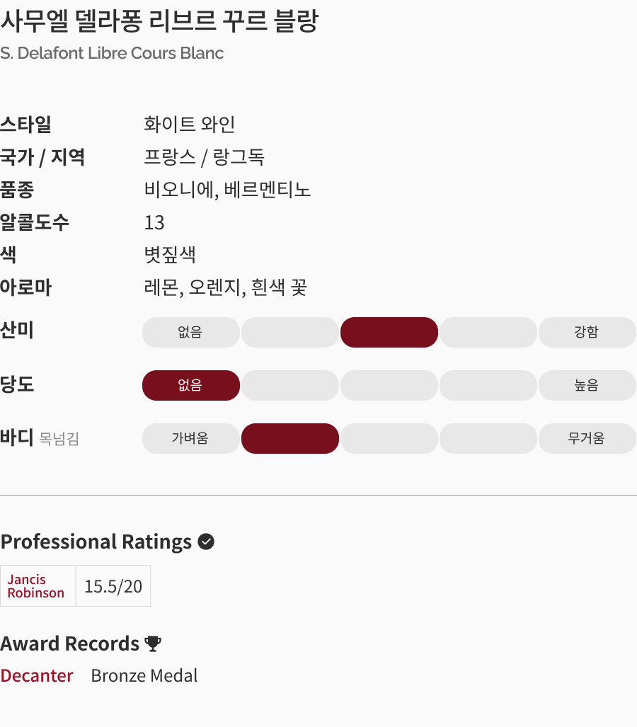 Nose : 레몬, 오렌지 등의 과일 향, 진한 흰색 꽃 향