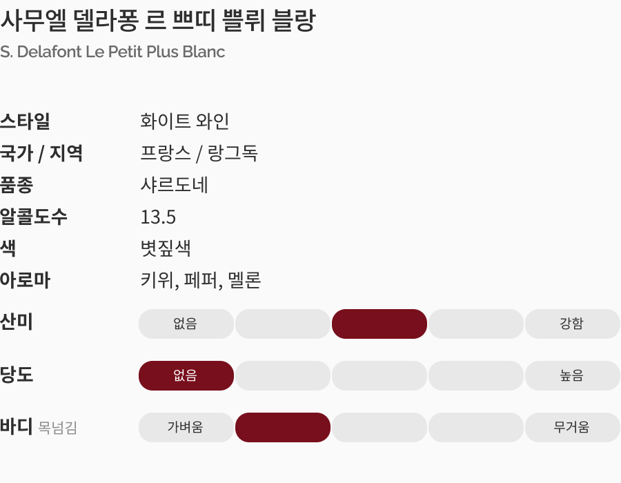 Nose : 키위, 페퍼, 잘 익은 멜론