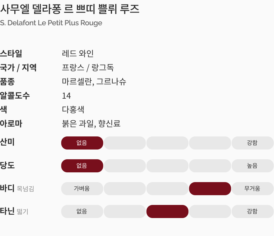 랑그독 지역 최고의 와인 메이커 Samuel Delafont가 랑그독 지역의 훌륭한 떼루아 만을 엄선하여 특별하게 블렌딩, 숙성시키는 와인이며, 화학 비료나 살충제를 사용하지 않 고 자연 친화적인 방법으로 만드는 오가닉 와인!