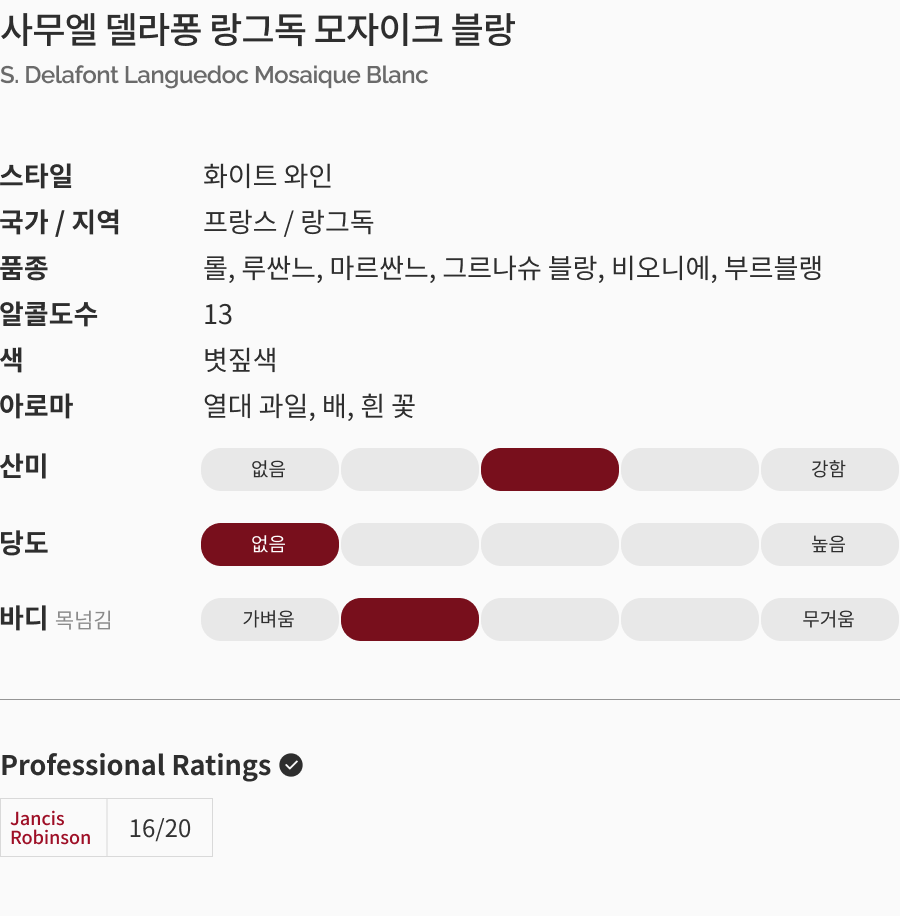 Mouth: 복합적이고 풍성한 과일 향, 라운드하고 신선하며 긴 피니쉬