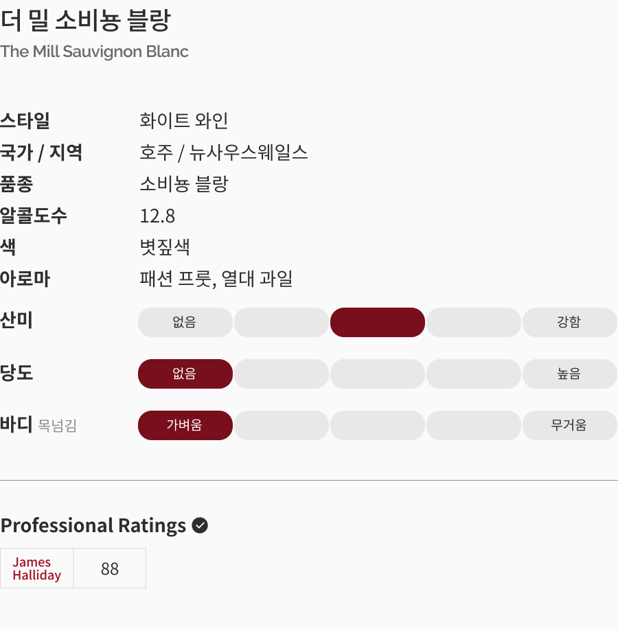 Mouth: 잘 숙성된 구스베리, 패션 프룻의 감미에 미네랄 향, 크리미한 질감이 더해져 신선하며 전체적으로 부드러운 느낌의 화이트 와인
