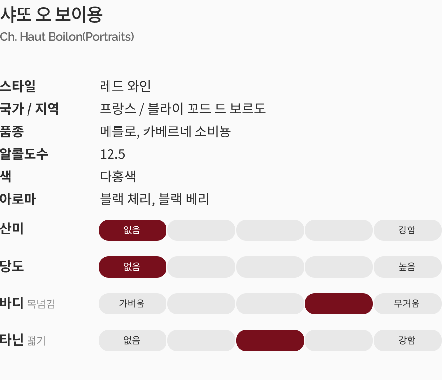 선명하고 투명한 레드 루비 컬러를 띄며, 블랙 체리, 블랙베리 등의 신선한 과일 향과 향신료의 향이 특징이다. 부드럽고 라운드한 타닌과 풍부한 블랙 커런트의 맛으로 마무리되는 고급스럽고 섬세한 와인이다.