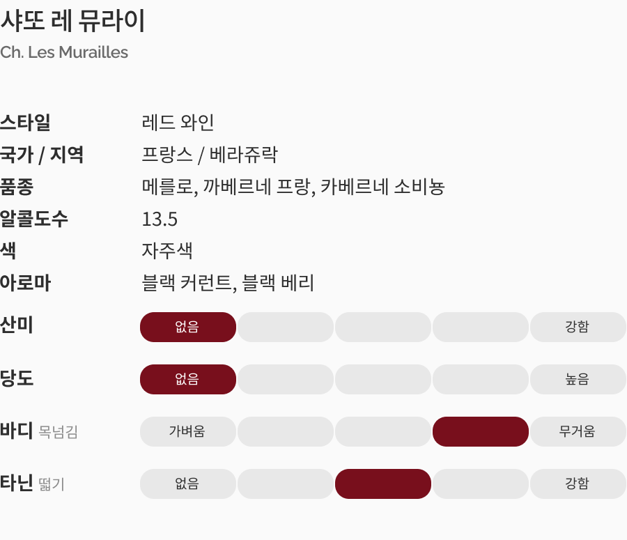 Mouth : 벨벳처럼 부드럽고 라운드한 타닌과 함께 블랙 베리, 자두 등 신선한 검붉은 과실의 맛이 오랫동안 유지된다.