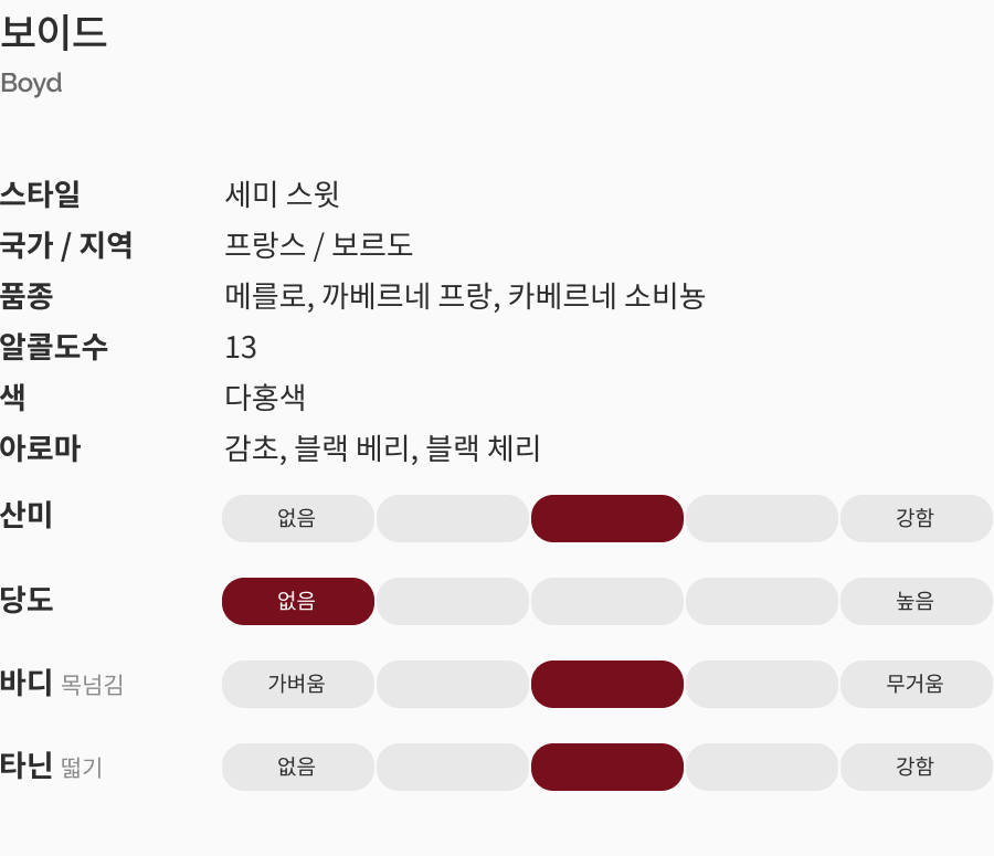 진하고 깊은 붉은빛을 띠며 숙성된 과일과 섬세한 향신료 향이 첫인상을 만들고 섬세하고 고급스럽게 느껴지는 기분 좋은 타닌이 이어진다. 감초, 블랙베리, 블랙 체리 등의 풍성한 아로마가 꾸준하게 피어올라 부드럽게 입안에 퍼진다. 과일과 오크 숙성에서 오는 나무향이 완벽한 밸런스를 만들며 신선한 피니쉬가 이 훌륭한 와인의 복합미와 긴 여운을 만든다.
